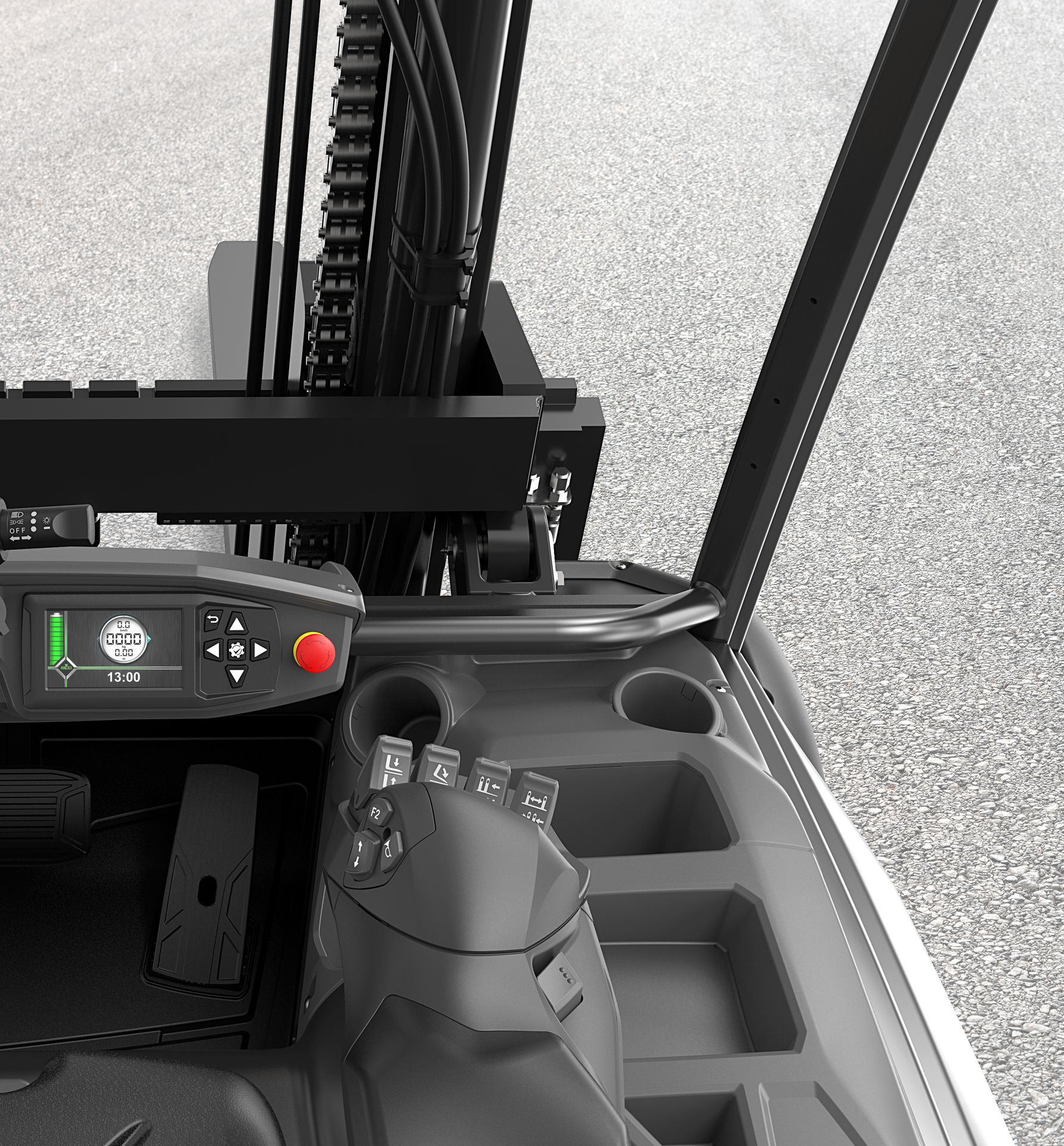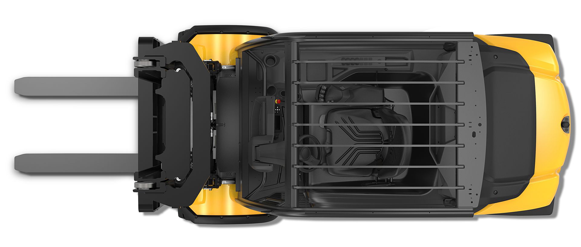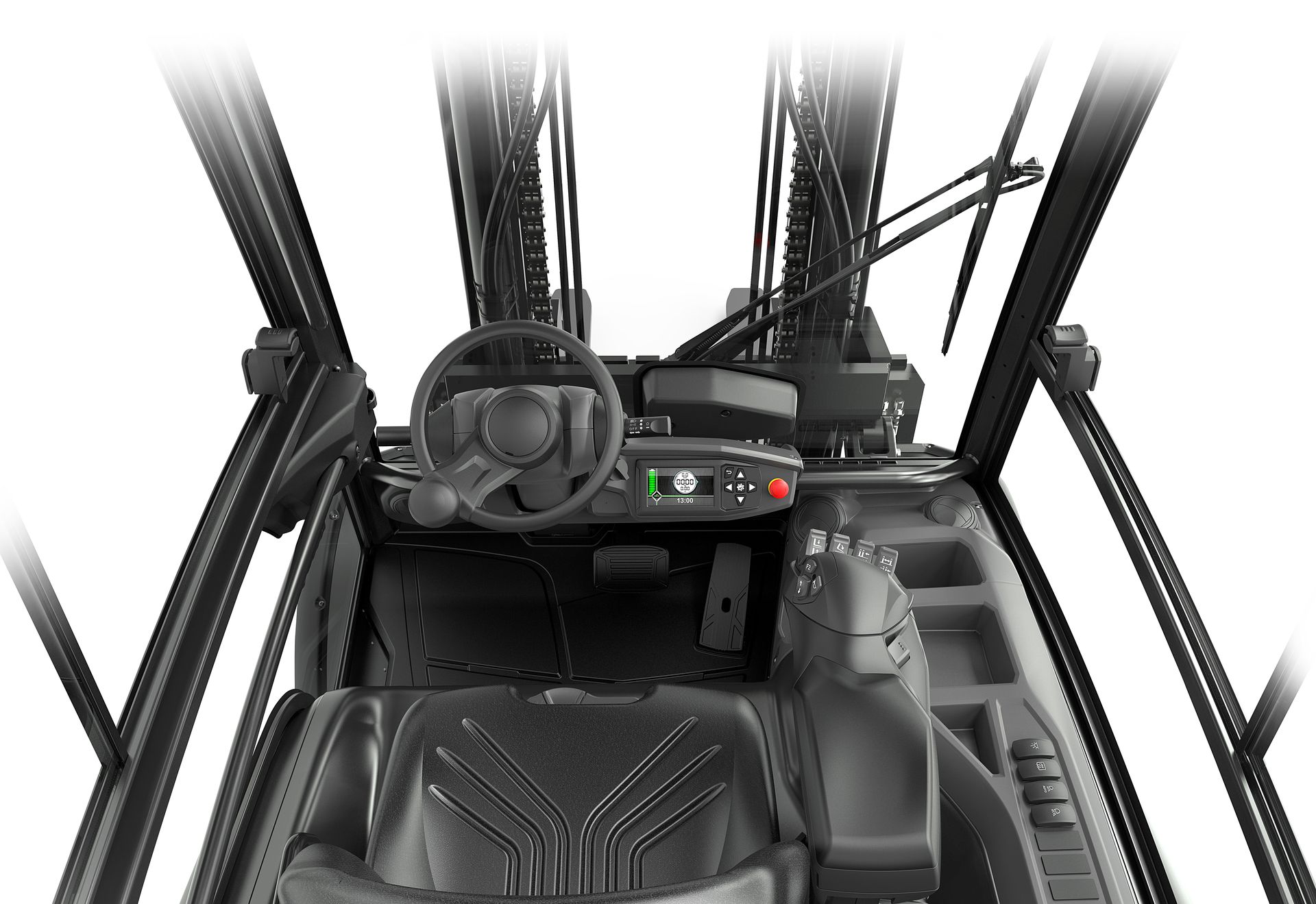 El FHB tiene un diseño libre de obstáculos, que proporciona una visión de amplio alcance y elimina la necesidad de estirarse, forzarse o inclinarse fuera de la carretilla para ver.