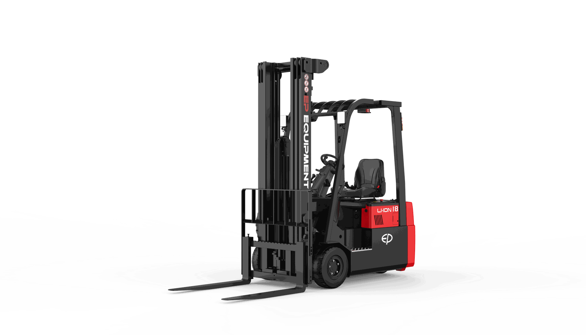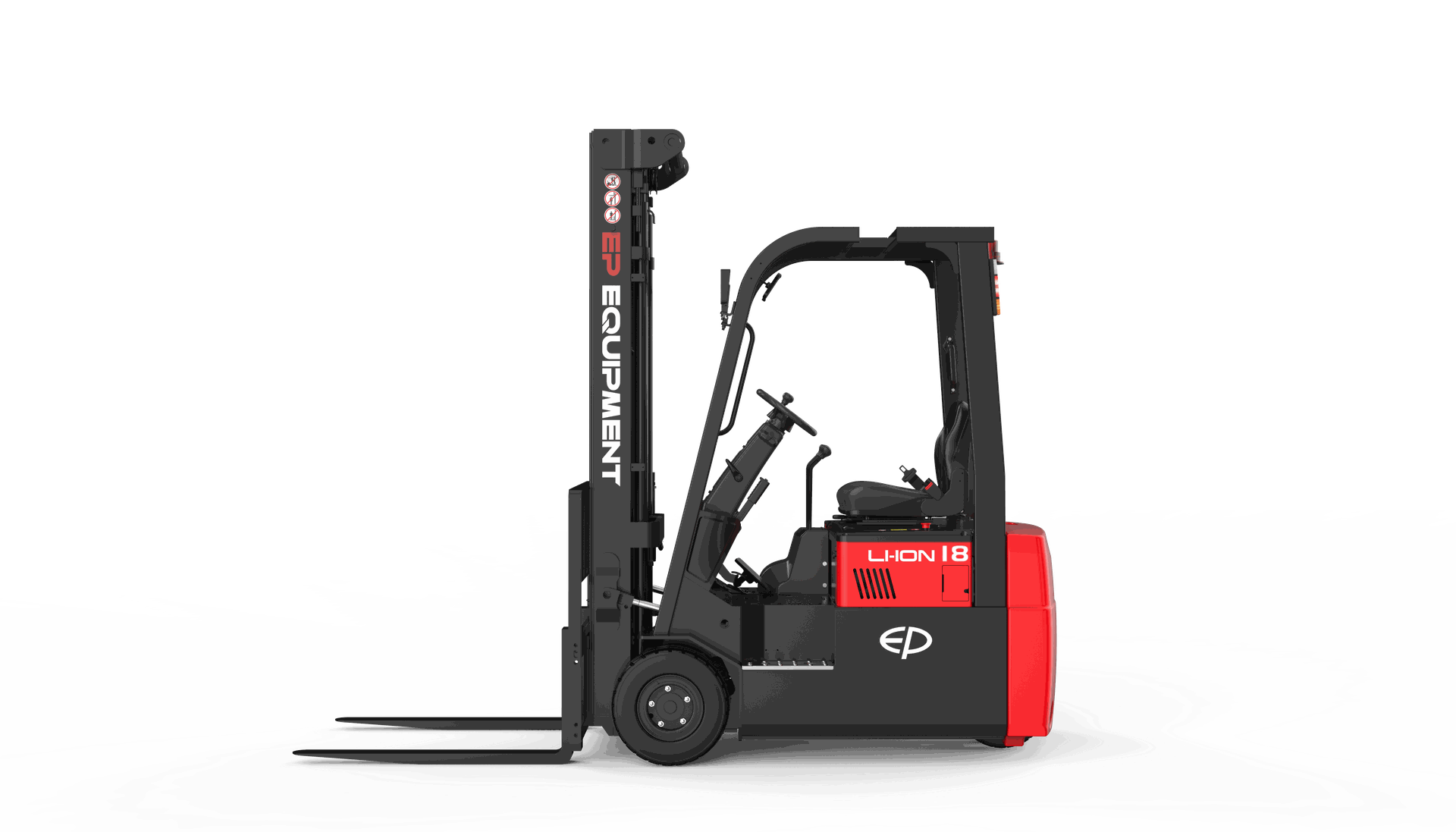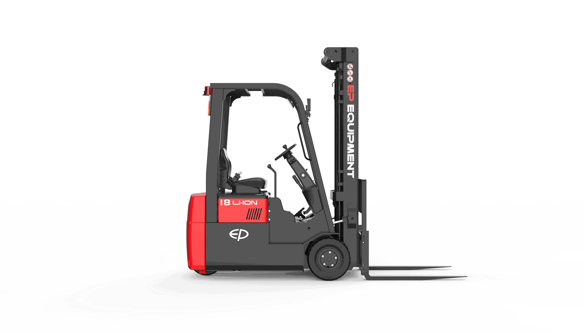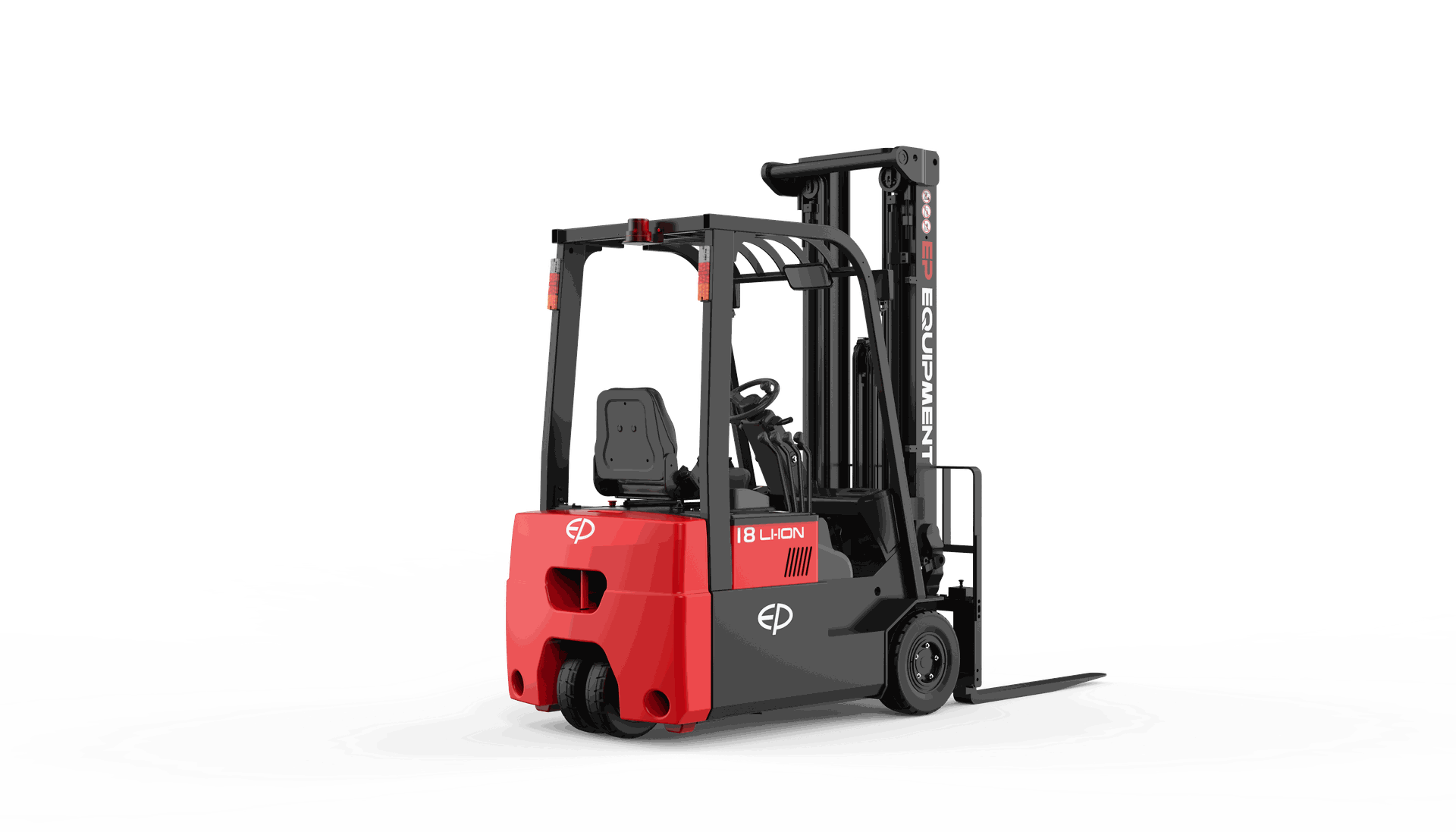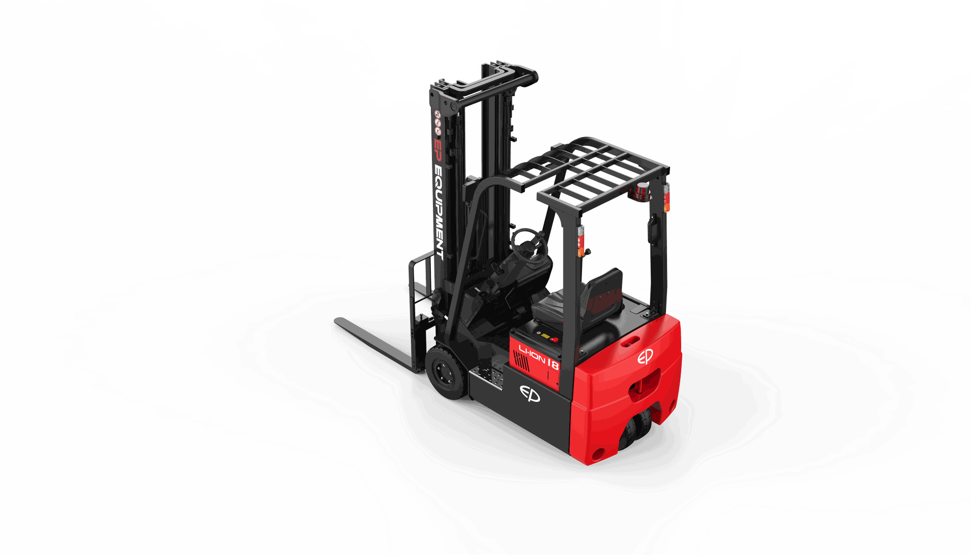 La CPD18TVL de EP Equipment es una carretilla elevadora eléctrica de tres ruedas, con una capacidad de carga de 1800 kg y diseñada específicamente para operar en pasillos estrechos, gracias a su radio de giro de 1550 mm.